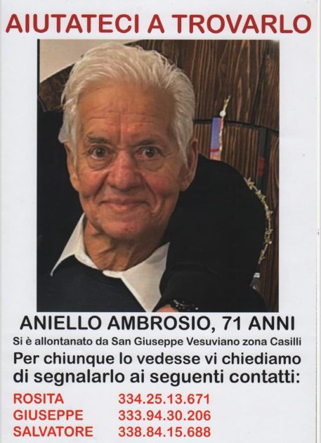 Aniello Ambrosio ha lasciato le chiavi di casa su un muretto di fronte al portone d’ingresso a, perché la moglie le trovasse, dopodiché, è sparito. Tutti lo cercano dalle 13 del 20 febbraio. Gli amici, i volontari e la polizia hanno perlustrato ogni zona del vesuviano. Il 71enne pensionato si è allontanato dalla sua casa a San Giuseppe Vesuviano.