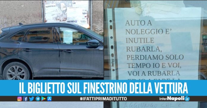 Sta facendo il giro del web il biglietto apparso sul finestrino di una vettura ad Arzano. “Auto a noleggio, è inutile rubarla, perdiamo solo tempo io e voi, voi a rubarla ed io a fare denuncia. Grazie. Aggiungo che è anche vuota nel bagagliaio“ si legge nel messaggio. A postare la foto è la pagina Facebook Arzano News. Lo sfogo dell’automobilista è figlio dell’esasperazione dei cittadini, vittime da diversi mesi di continui furti in città.