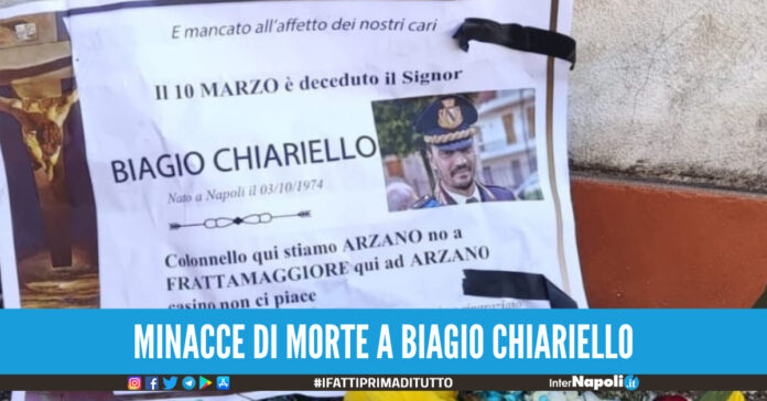 All’interno del comando della Polizia locale è stato rinvenuto, affisso sul muro interno al parco macchine, un necrologio per il comandante Chiariello impegnato da tempo al ripristino della legalità e nella lotta contro il clan della 167. Un manifesto funerario con tanto di foto del comandante e con scritte frasi eloquenti: “È mancato all’affetto dei suoi cari. Il 10 marzo è deceduto il signor Biagio Chiariello”. Ancora: “Colonnello qui siamo ad Arzano no a Frattamaggiore qui il casino non ci piace”. Concludendo: “i familiari e i parenti ne danno il triste annuncio”.