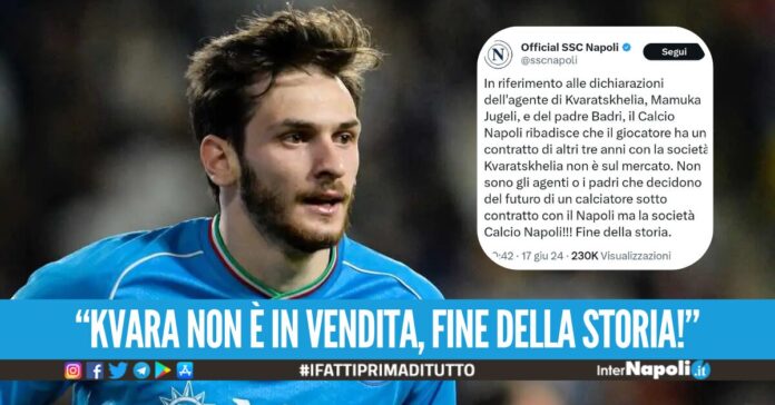 “Kvaratskhelia non è sul mercato – prosegue la nota -. Non sono gli agenti o i padri che decidono del futuro di un calciatore sotto contratto con il Napoli ma la società Calcio Napoli! Fine della storia”.
