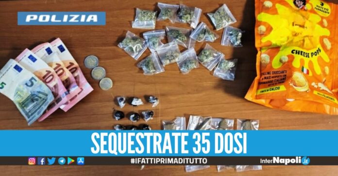 Pertanto, gli operatori lo hanno immediatamente raggiunto trovandolo in possesso di 40 euro, mentre, in una busta di patatine posta vicino ai cassonetti della nettezza urbana, dove lo avevano visto prelevare lo stupefacente, sono state rinvenute 35 dosi di marijuana del peso complessivo di circa 50 grammi.