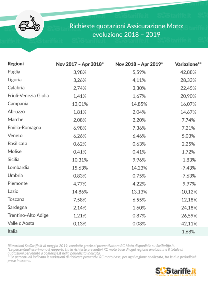 Passando ai raggi X l’uso del comparatore da parte dei motociclisti italiani emerge che laregione che ha richiesto più preventivi nell’ultimo anno rispetto al precedente è laPuglia (+ 42,88%), seguita dalla Liguria (+ 28,33%) e dalla Calabria (+22,45%).