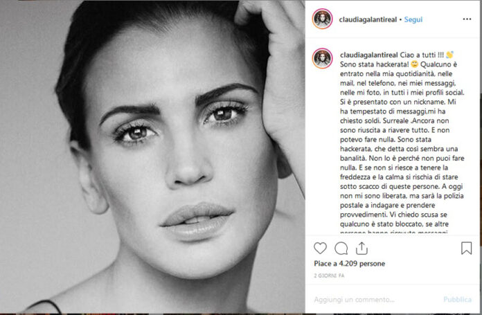 Una sventura che Claudia non è ancora riuscita a risolvere del tutto: “Ciao a tutti !!! Sono stata hackerata! – ha confessato con un post dal social – Qualcuno è entrato nella mia quotidianità, nelle mail, nel telefono, nei miei messaggi, nelle mi foto, in tutti i miei profili social. Si è presentato con un nickname. Mi ha tempestato di messaggi, mi ha chiesto soldi. Surreale . Ancora non sono riuscita a riavere tutto. E non potevo fare nulla”.