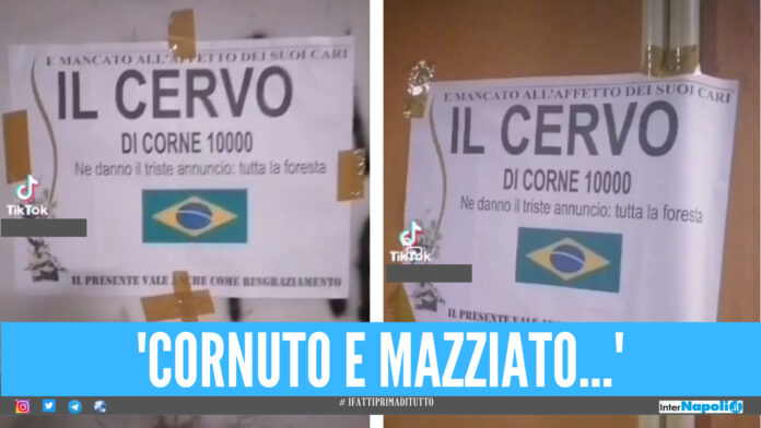 Da Scampia a Piscinola, dal Don Guanella a Marianella fino a Secondigliano. Stamattina l’area a Nord di Napoli si è svegliata tappezzata di misteriosi manifesti. La scritta è chiara: “E’ mancato all’affetto dei suoi cari IL CERVO’ di corne 10000. Ne danno il triste annuncio: tutta la foresta”. Oltre la scritta c’è anche una bandiera del Brasile, a significare chissà cosa. Questo il messaggio scritto sul manifesto tipo funebre, affisso di pareti, serrande e mura dei quartieri periferici di Napoli. I manifesti parlerebbero di un fantomatico ragazzo che sarebbe stato tradito dalla moglie. Storia vera? Semplice goliardia? Non si sa veramente come sia successo. Certo è che il caso sta spopolando non solo nelle tabaccherie dove è partita la corsa al lotto ma anche sui social, in particolare su TikTok dove circola un video con tutti i manifesti ‘del cervo’ affissi nei vari quartieri. E non mancano le polemiche e le reazioni più disparate.