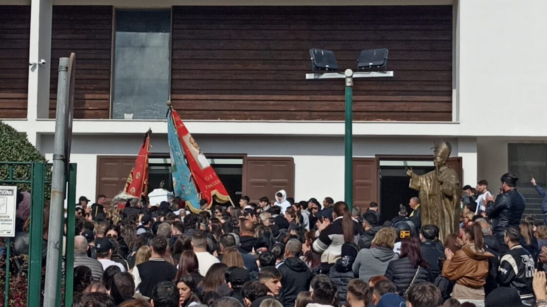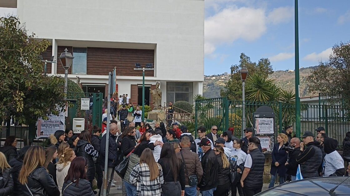Diversi gli striscioni inneggianti al giovane mentre i suoi coetanei indossano la maglia raffigurante Francesco Pio Maimone. Fuori dalla chiesa c’è lo striscione con la foto di Francesco Pio e il messaggio “Dentro ogni nostro pensiero, c’è sempre un po’ di te” . Presente il sindaco Manfredi, Corona di fiori del Comune