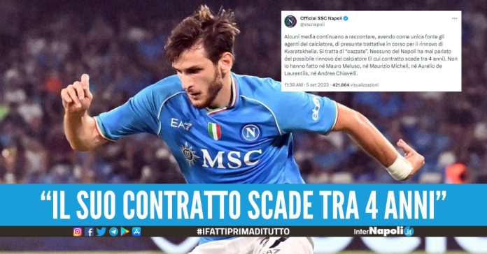 La SSC Napoli di Aurelio De Laurentiis ha emesso un duro comunicatoa proposito dei rumors che vedrebbero la società impegnata con il rinnovo contrattuale di Kvaratskhelia. Comunicato ufficiale SSC Napoli: “Alcuni media continuano a raccontare, avendo come unica fonte gli agenti del calciatore, di presunte trattative in corso per il rinnovo di Kvaratskhelia. Si tratta di “cazzate”. Nessuno del Napoli ha mai parlato del possibile rinnovo del calciatore (il cui contratto scade tra 4 anni). Non lo hanno fatto né Mauro Meluso, né Maurizio Micheli, né Aurelio de Laurentiis, né Andrea Chiavelli”.