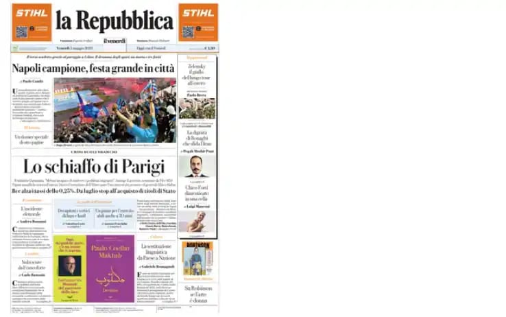 Anche i giornali, com’è giusto che sia, celebrano il trionfo della squadra di Spalletti. Da “inchinatevi” del Corriere dello Sport a “Napoli in paradiso” della Gazzetta, ecco le prime pagine dei principali quotidiani nazionali.