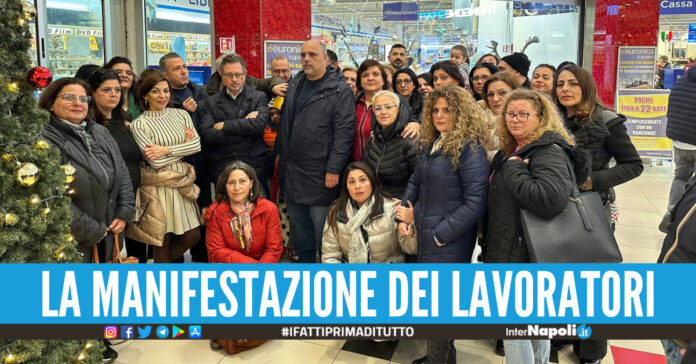 Manifestazione dei lavoratori della Coop di Afragola, la mattina di sabato 2 dicembre, che si sono visti recapitare le lettere di licenziamento. Dal 1 gennaio i dipendenti, circa 150, vedranno cessare il proprio contratto. Francesco Emilio Borrelli, deputato di Alleanza Verdi-Sinistra, e Rosario Visone, rappresentante di Europa Verde del territorio, hanno partecipato al presidio, presso il centro commerciale di Afragola, per manifestare il pieno sostegno ai lavoratori a rischio licenziamento.