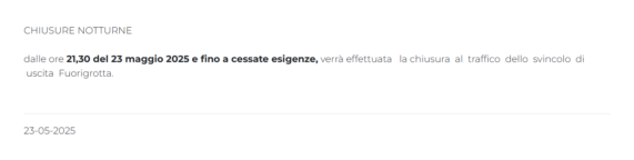 La misura, adottata su disposizione delle autorità competenti per ragioni di ordine pubblico e sicurezza, resterà in vigore “fino a quando gli eventi lo riterranno opportuno, salvo diverse indicazioni”. Per evitare ulteriori disagi, sono stati inoltre sospesi tutti i cantieri notturni programmati lungo l’infrastruttura.