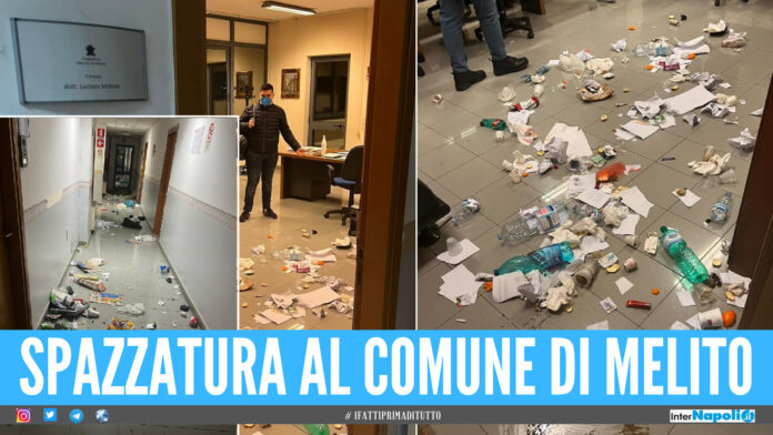 Comune di Melito messo a soqquadro e ricoperto di spazzatura dai dipendenti della ditta che si occupa delle pulizie. Il motivo? La riduzione dello stipendio previsto dal nuovo appalto. A denunciare lo stato di degrado è il sindaco Luciano Mottola: “Queste sono le condizioni igieniche in cui è stata ridotta la mia stanza e l’intero Comune di Melito questa sera. Una situazione sconcertante quella in cui mi sono imbattuto pochi minuti fa. Dal piano terra all’ultimo dei piani del Municipio cumuli e cumuli di rifiuti. Resti di cibo, scatolame di vario genere e spazzatura di ogni tipo con atti dell’Ente strappati e gettati in ogni dove. A rendersi protagonisti di un gesto tanto incivile, quanto pare, alcuni dipendenti della ditta che si occupa della pulizia degli immobili comunali”.