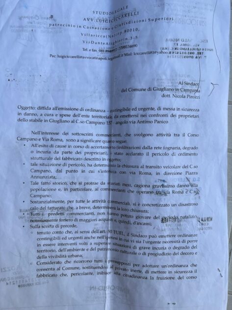In alto, la lettera di diffida dell’avvocato Luigi Ciccarelli che segue la vicenda dei commercianti, con in allegato le firme e i timbri di questi ultimi e delle loro attività