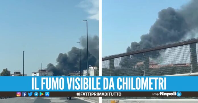 Il cielo di Napoli coperto da una densissima nube nera. È il risultato di un’esplosione, in seguito alla quale è divampato un incendio, avvenuta intorno alle 15 di questo pomeriggio in una ditta di autotrasporti nel quartiere di Ponticelli, nella zona industriale orientale di Napoli. Sul posto sono giunti i Vigili del Fuoco dei distaccamenti Orientale, Pianura e Ponticelli, impegnati a spegnere il rogo e a circoscrivere l’intera zona.