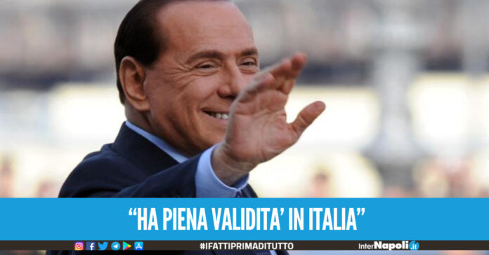 Spunta un nuovo testamento di Silvio Berlusconi. Il testamento speciale, che sarebbe stato sottoscritto dal Cav in Colombia, “è stato depositato presso un Notaio italiano del distretto notarile di Napoli, il giorno 3 ottobre corrente, conferendogli piena validità per la legge italiana”, spiega in una nota l’avvocato Erich Grimaldi del Foro di Napoli, in qualità di legale e di procuratore generale del legatario torinese in Colombia, Marco Di Nunzio.