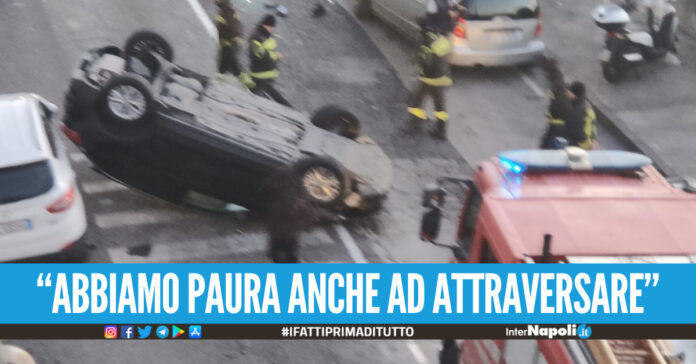 Un’auto si è ribaltata questa mattina all’alba in via Caravaggio. Un boato ha svegliato i residenti che hanno avvisato dell’accaduto il deputato Francesco Emilio Borrelli. “È il secondo episodio nel giro di un anno” racconta Francesco, un cittadino che abita proprio dov’è accaduto l’incidente “l’estate scorsa, proprio nello stesso punto, un’altra auto si era ribaltata. Su questa strada chi passa in auto e moto sfreccia come se fosse in pista e noi non ci sentiamo sicuri nemmeno più ad attraversare la strada. È una situazione che mette a rischio l’incolumità di tutti, anche degli animali. Qui vicino c’è una colonia felina e in questi mesi sono stati investiti diversi gatti” conclude Francesco.
