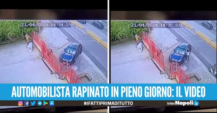 Rapina choc avvenuta a Napoli. Le telecamere inquadrano un cittadino che rientra a casa a bordo della sua vettura e, mentre attende l’apertura del cancello, da uno scooter che sopraggiunge alle spalle, con un salto di lince, un delinquente scende in corsa e si lancia verso l’automobilista, sfonda il finestrino con il calcio della pistola e gliela punta alla tempia, lo deruba e scappa via. Accade in pieno giorno, alle ore 13,00 in via Roma verso Scampia.