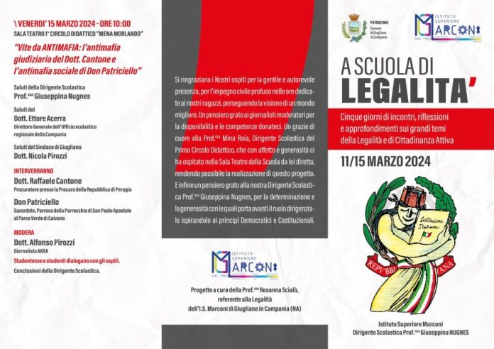 Legalità e cittadinanza attiva alla base degli incontri organizzati nell’ambito della settimana della Legalità organizzata dall’I.S. Guglielmo Marconi di Giugliano in Campania. Dall’11 al 15 marzo la sala consiliare del comune di Qualiano e la sala teatro del Primo Circolo Didattico ospiterann relatori, docenti e studenti per un ciclo di incontri dedicati a riflessioni ed approfondimenti su temi fondamentali. Grazie all’impegno e alla mission della Dirigente Scolastica dott.Giuseppina Nugnes gli studenti avranno la possibilità di vivere momenti di arricchimento ed essere sensibilizzati ulteriormente su tematiche quali bullismo, cyberbullismo, violenza di genere, ecomafie, vite da antimafia. L’istituto da sempre in prima linea nella promozione di progetti culturali di ampio respiro vedrà la partecipazione del procuratore di Perugia Raffaele Cantone, Raffaele Del Giudice, Salvatore Micillo, Lucia Fortini, Ettore Acerra, Anna Paparone, Don Maurizio Patriciello, Don Luigi Merola, Enzo Tosti, i sindaci dei comuni di Giugliano e Qualiano, Nicola Pirozzi e Raffaele De Leonardis e gli assessori Isabella Riccardo, Rosalba Fele, Antimo Rinaldi. .