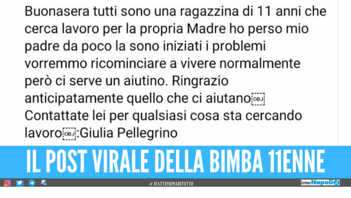 L’ANNUNCIO ALL’INSAPUTA DELLA MAMMA – Tutto è cambiato, come predetto, grazie ad un post pubblicato su un gruppo Facebook del suo quartiere, l’Appio-Latino/Tuscolano. Sofia – scrive su Il Messaggero Alessia Marani – vive con la mamma nei pressi di Colli Albani. Quest’ultima è disoccupata e, per provare ad aiutare, la piccola si mette a cercare aiuto alle persone presenti nel gruppo social. «Buonasera a tutti sono una ragazzina di 11 anni che cerca lavoro per la propria Madre, ho perso mio padre da poco là sono iniziati i problemi vorremmo ricominciare a vivere normalmente però ci serve un aiutino. Ringrazio anticipatamente quelli che ci aiutano. Contattate lei per qualsiasi cosa sta cercando lavoro: Giulia Pellegrino».