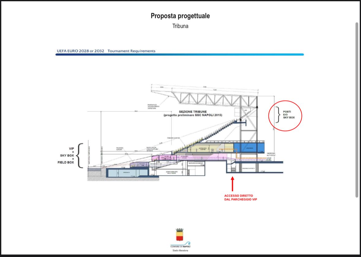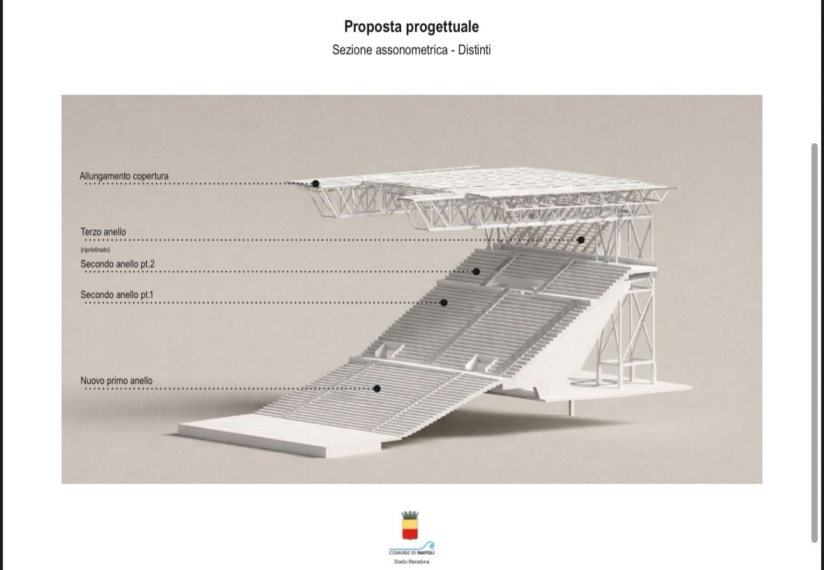 Il nuovo Stadio Diego Armando Maradona di Napoli avrà tre anelli, quattro piani e sarà al coperto. Sarà infatti riaperto il terzo anello, mentre il secondo anello verrà diviso in due piani, ci sarà un nuovo primo anello che arriverà fino a bordo campo, andando a coprire l’attuale pista di atletica, che sarà rimossa. Sarà allungata inoltre la copertura che andrà a coprire tutte le sedute, in modo da proteggere gli spettatori dalle intemperie.