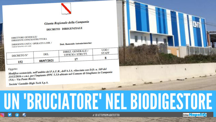 “Modifica sostanziale, nell’ambito del P.A.U.R., dell’A.I.A. rilasciata con D.D. n. 169 del 23/12/2016 e s.m.i. per l’impianto IPPC 5.3.b ubicato nel Comune di Giugliano in Campania (NA) – Via Ponte Riccio. Societa’ Castaldo High Tech S.p.A”. Questo, in gergo tecnico, l’oggetto del decreto n.152 a firma del dirigente Dott. Antonio Ramondo, risalente all’8 luglio 2021, con cui la Regione Campania ha autorizzato la società Castaldo High Tech S.p.A. ad ampliare il tipo e la quantità dei rifiuti da trattare nell’oramai famoso biodigestore situato nella zona Asi di Giugliano.