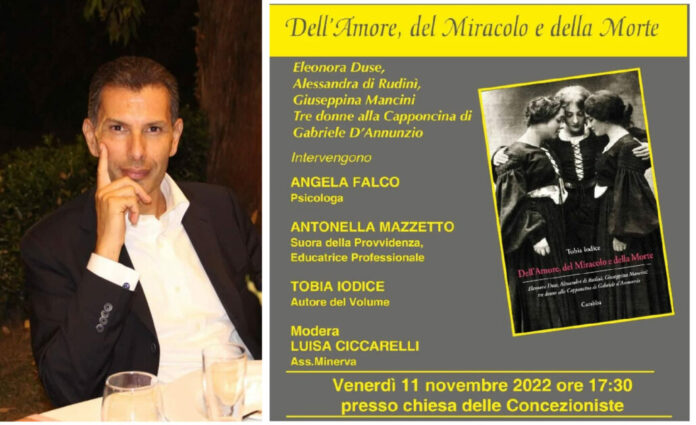 Giugliano. Dopo il lusinghiero successo riscosso a Francavilla, a Pescara e, la scorsa settimana, a Napoli, venerdì 11 novembre, alle ore 17:30, presso la chiesa delle Concezioniste, in via Concezione, Tobia Iodice presenterà anche a Giugliano il suo ultimo lavoro ‘Dell’Amore, Del Miracolo e della Morte’. Tre donne alla Capponcina di Gabriele d’Annunzio. Il testo, pubblicato dalla casa editrice Carabba, la stessa per la quale facevano uscire le loro opere Pirandello e lo stesso d’Annunzio, racconta con stile accattivante e piglio romanzesco la vita di Eleonora Duse, la più grande attrice di tutti i tempi, Alessandra di Rudinì, figlia del Presidente del Consiglio dell’epoca, e Giuseppina Mancini, nobildonna fiorentina, che tra il 1898 e il 1910 vissero a fianco del Poeta nella villa che questi aveva preso in affitto e arredato secondo il suo gusto sfarzoso sui colli sopra Firenze.