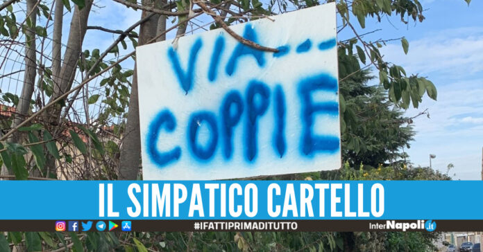 “Via… coppie”. Questo quanto scritto su un cartello apparso a Calvizzano in via Corigliano. La foto, riportata da Calvizzano Web, ha attirato la curiosità di tantissimi utenti sui social. La stradina in questione, ovvero una piccola traversina senza uscita, è notoriamente isolata, venendo percorsa ogni giorno da pochissime auto. Con il calar della notte, poi, la possibilità di vedere circolare qualche vettura diminuisce ulteriormente. Approfittando di ciò, qualche coppietta deve essersi appartata lontana da occhi indiscreti. La loro presenza, però, deve aver spinto qualcuno ad affissare il curioso cartello.